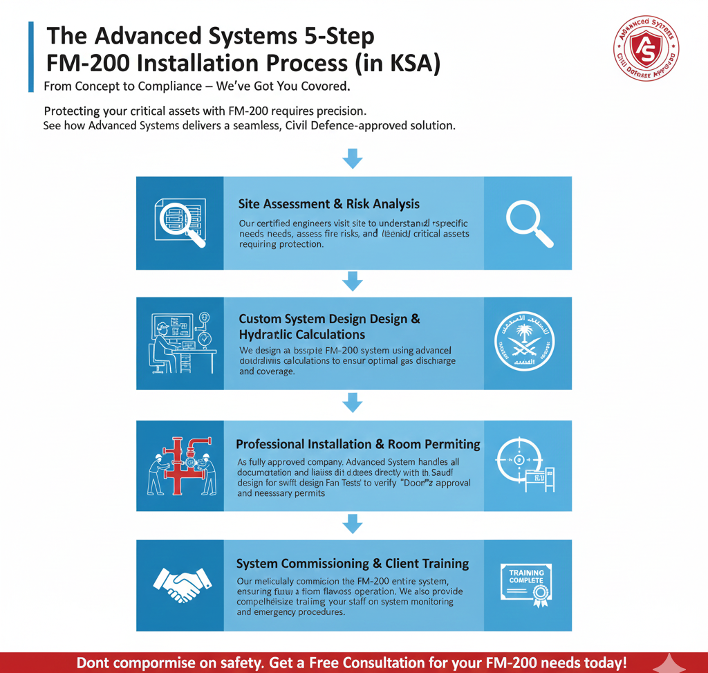 Stop wasting time with paperwork. As a Civil Defense-approved company, Advanced Systems ensures your FM-200 installation is compliant from day one. They help you secure your “Salamah” certification faster, so you can focus on scaling your business.